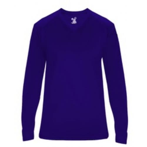 Badger Women's V-Neck L/S Tee 100% Soft Polyester Moisture Management/Antimicrobial Performance Fabric. UVA and UVB sun protection in areas covered by the shirt (UPF 50+). Superior interlock fabric for comfort. Self-fabric collar. Badger sport paneled shoulder. Double-needle hem with tack. Badger heat seal logo on left sleeve.