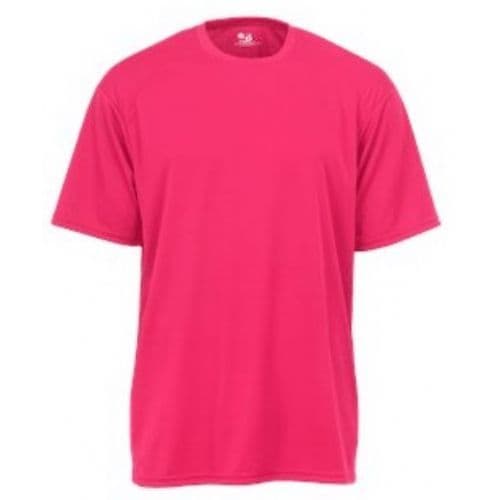 100% Polyester moisture management. Self-fabric collar. Badger sport paneled shoulder. Double-needle hem with tack. Badger heat seal logo on left sleeve.