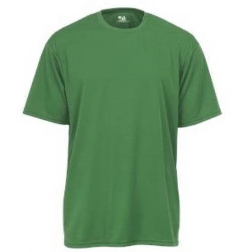 100% Polyester moisture management. Self-fabric collar. Badger sport paneled shoulder. Double-needle hem with tack. Badger heat seal logo on left sleeve.