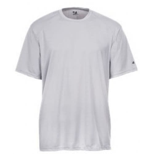 100% Polyester moisture management. Self-fabric collar. Badger sport paneled shoulder. Double-needle hem with tack. Badger heat seal logo on left sleeve.