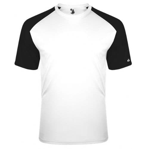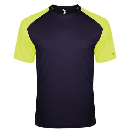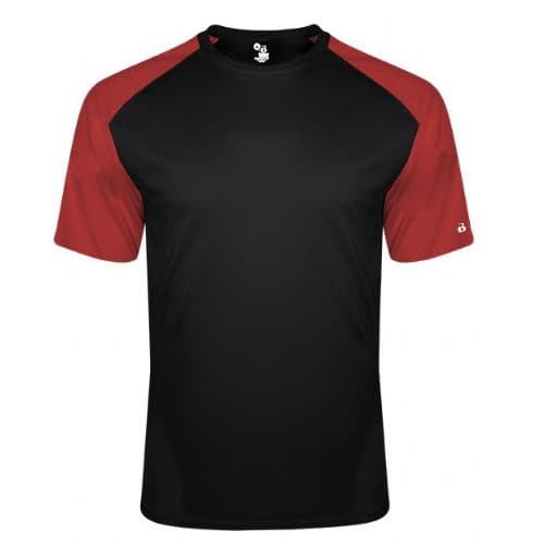 Badger Youth Breakout Tee 100% Sublimated Polyester moisture management/ antimicrobial performance fabric. Contrast textured shoulders and sleeves. Badger sport shoulder for maximum movement. Self-fabric collar. Double-needle hem. Badger heat seal logo on left sleeve.