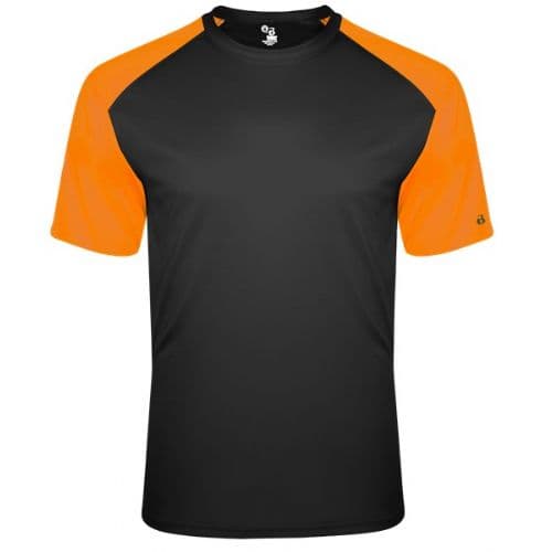 Badger Youth Breakout Tee 100% Sublimated Polyester moisture management/ antimicrobial performance fabric. Contrast textured shoulders and sleeves. Badger sport shoulder for maximum movement. Self-fabric collar. Double-needle hem. Badger heat seal logo on left sleeve.