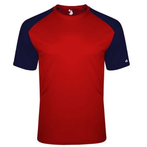 Badger Youth Breakout Tee 100% Sublimated Polyester moisture management/ antimicrobial performance fabric. Contrast textured shoulders and sleeves. Badger sport shoulder for maximum movement. Self-fabric collar. Double-needle hem. Badger heat seal logo on left sleeve.