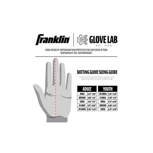 Franklin CFX Pro Batting Gloves As the official batting gloves of the MLB, the CFX Pro is the most popular on field batting glove used by MLB pros. Constructed with premium quality sheepskin leather, these batting gloves are built to last season after season for baseball and softball players of all ages. Designed to fit the natural curves of your hand, these adult and youth batting gloves are made to fit comfortably without bunching or tearing. Tectonic inserts in the handback help these batting gloves maintain flexibility for a snug and flexible fit. The rugged leather palm helps players maintain grip on the bat in all weather conditions for increased bat control and superior performance. These batting gloves are the standard for baseball and softball players at the highest levels. Play like the pros this season and grab yourself a pair of Franklin Sports CFX Pro batting gloves today!