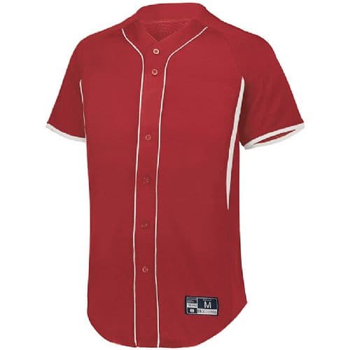 Holloway Full Button Baseball Jersey Dry-Excel 100% wicking polyester diamond knit with true hue technology that helps prevent dye migration. Dry-Excel 100% wicking warp mesh inserts and back yoke with true hue technology. Wicks moisture. Pad print label. Outside locker label. Full-button jersey. Buttons spaced for easy embellishment. Contrast color inserts and piping. Raglan sleeves. Fishtail bottom.