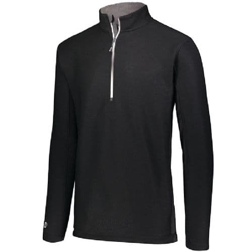 Holloway Invert 1/2 Zip Pullover Sweater knit bonded to microfleece, offering a Durable Water Resistant finish for weather resistance and microfleece lining for maximum warmth. Storm Dfend Technology features durable water resistant finish keeps you dry while knit soft shell breathes to keep you comfortable. Wik-Sof. Dry-Excel inserts and side. Wicks Moisture. Woven label. Half-zip pullover style with ombre gradient zipper and reflective zipper pull. Stretch woven zipper garage and storm flap. Set-in sleeves. Side zippered pockets. Open bottom.