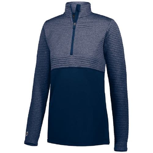 Holloway Ladies' 3D Regulate Pullover 100% Polyester heathered knit with quilted insulation for added warmth. Wik-Sof™ performance fleece lower body. Ladies' fit. Woven label. Half-zip pullover style with storm flap and zipper garage. Pleated back detail. Set-in sleeves. Front zippered pockets. Open bottom.