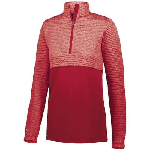 Holloway Ladies' 3D Regulate Pullover 100% Polyester heathered knit with quilted insulation for added warmth. Wik-Sof™ performance fleece lower body. Ladies' fit. Woven label. Half-zip pullover style with storm flap and zipper garage. Pleated back detail. Set-in sleeves. Front zippered pockets. Open bottom.