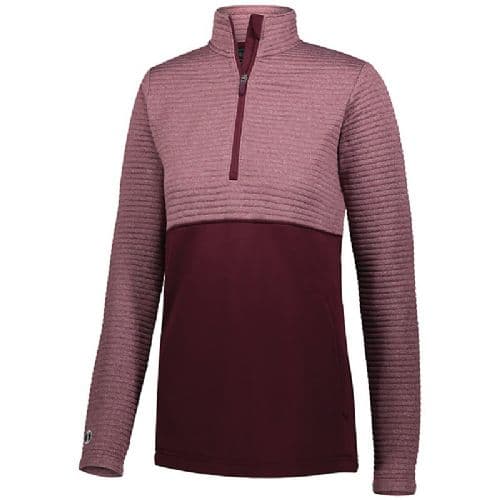 Holloway Ladies' 3D Regulate Pullover 100% Polyester heathered knit with quilted insulation for added warmth. Wik-Sof™ performance fleece lower body. Ladies' fit. Woven label. Half-zip pullover style with storm flap and zipper garage. Pleated back detail. Set-in sleeves. Front zippered pockets. Open bottom.