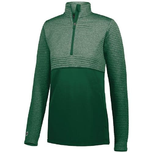 Holloway Ladies' 3D Regulate Pullover 100% Polyester heathered knit with quilted insulation for added warmth. Wik-Sof™ performance fleece lower body. Ladies' fit. Woven label. Half-zip pullover style with storm flap and zipper garage. Pleated back detail. Set-in sleeves. Front zippered pockets. Open bottom.