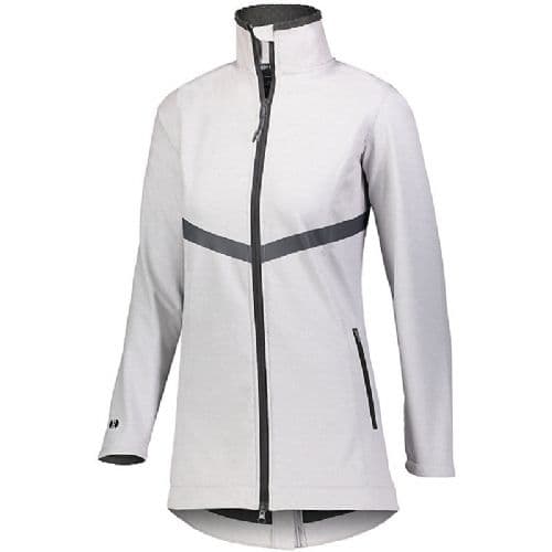 Holloway Ladies' 3D Regulate Soft Shell Jacket 3D Regulate soft shell outer fabric in 96% Polyester/4% Spandex, 4-way stretch bonded to 100% Polyester, 3D Waffle textured brushed back for breathable warmth. Inside 3D Regulate soft shell fabric rolls over to the front of collar for softness and comfort. Welded silicone accents on body. Ladies' fit. Woven label. Zipper garage with partial storm flap. Center front two-way zipper with reflective zipper pull. Set-in sleeves. Front zippered pockets. Dual inside pockets. Internal storm cuffs for complete weather protection. Open bottom with extended dropped tail. Water-resistant.