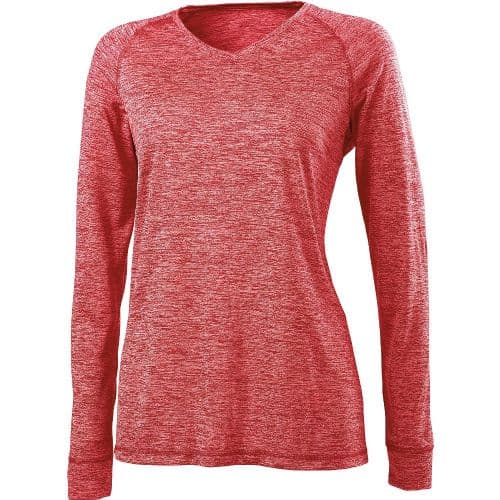 Holloway Ladies' Electrify 2.0 L/S V-Neck Shirt Snowy Heather fabric is a Polyester knit with high mechanical stretch and odor-resistant treatment. Bold, two-color heather pattern achieved in the dye process allowing for risk free decoration. Raglan sleeves for a greater range-of-motion. Classic fit type.