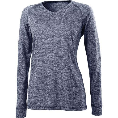 Holloway Ladies' Electrify 2.0 L/S V-Neck Shirt Snowy Heather fabric is a Polyester knit with high mechanical stretch and odor-resistant treatment. Bold, two-color heather pattern achieved in the dye process allowing for risk free decoration. Raglan sleeves for a greater range-of-motion. Classic fit type.