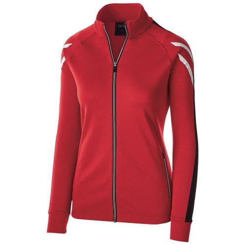 Holloway Ladies' Flux Jacket Temp-Sof fabric is a colored heather performance fleece with high mechanical stretch and a bird's eye flacked surface. Raglan sleeves for maximum mobility. Two-color front zippered pockets. Welded silicone tape accents at shoulders. Self fabric cuffs. Dual inside pockets. Classic fit.