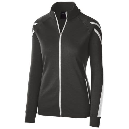 Holloway Ladies' Flux Jacket Temp-Sof fabric is a colored heather performance fleece with high mechanical stretch and a bird's eye flacked surface. Raglan sleeves for maximum mobility. Two-color front zippered pockets. Welded silicone tape accents at shoulders. Self fabric cuffs. Dual inside pockets. Classic fit.