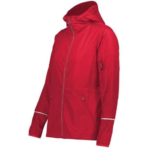 Stay warm and dry in the Ladies Packable Full Zip Jacket from Holloway.  This women's water-resistant jacket features an adjustable hood with  inside concealed cord locks, a reflective trim, and back vent with  adjustable closure for full decoration access. Spandex bound cuffs and  an adjustable elastic hidden drawcord at waist and bottom make sure you  keep the warmth in and the rain out.