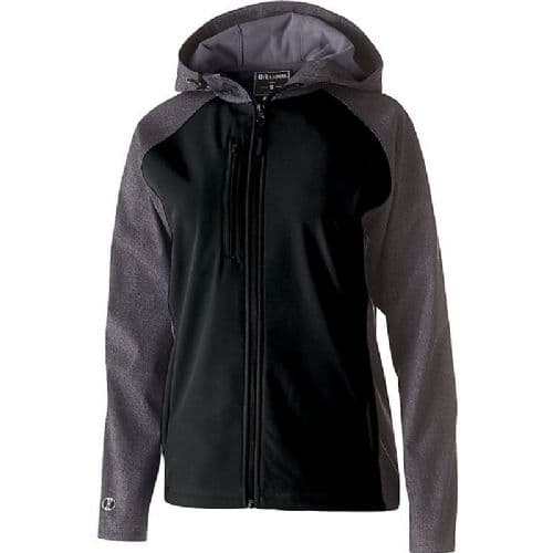 Holloway Ladies' Raider Softshell Jacket Lightweight, softshell outer fabric in 96% Polyester, 4% Spandex bonded to brushed jersey. Adjustable hood. Adjustable drop tail hem with hidden drawcord. Dual front and chest zippered pockets. Dual inside pockets. Classic Fit Type.