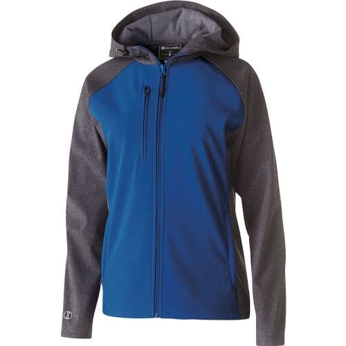 Holloway Ladies' Raider Softshell Jacket Lightweight, softshell outer fabric in 96% Polyester, 4% Spandex bonded to brushed jersey. Adjustable hood. Adjustable drop tail hem with hidden drawcord. Dual front and chest zippered pockets. Dual inside pockets. Classic Fit Type.