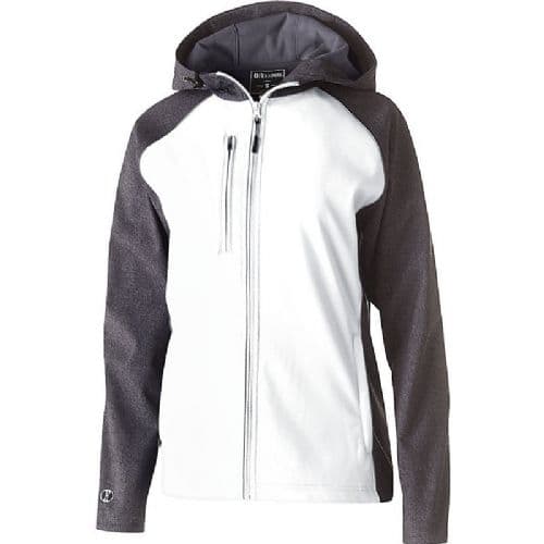 Holloway Ladies' Raider Softshell Jacket Lightweight, softshell outer fabric in 96% Polyester, 4% Spandex bonded to brushed jersey. Adjustable hood. Adjustable drop tail hem with hidden drawcord. Dual front and chest zippered pockets. Dual inside pockets. Classic Fit Type.