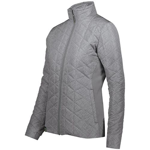 Holloway Ladies' Repreve® Eco Jacket 100% polyester MicroTec woven face with durable water-repellent finish to keep you dry. Made from Repreve® recycled polyester quilting for lightweight warmth. Weld engineered quilting that's decoration friendly. 78% polyester/22% spandex inserts, peached for softness. Ladies' fit. Woven labelFront zipper with antique nickel zipper pull and storm flap. Media port inside zippered valuables pocket. Front zippered pockets. Half-elastic cuffs. Dropped tail.