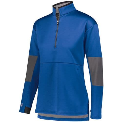 Experience the ultimate in softness and stretch with the Ladies Sof-Stretch Pullover by Holloway. Our Storm Dfend Technology features a durable water-resistant finish to keep you dry, while its knit softshell breathes to keep you comfortable. This polyester half-zip pullover features Sof-Stretch knit with DWR finish bonded to microfleece for warmth. The contrast color sleeve inserts add additional style to this versatile pullover.