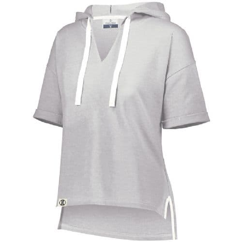 Holloway Ladies' Sophomore S/S Hoodie 7.8 ounce, 50% polyester/50% cotton french terry knit with vintage heathered look for wor-in feel. Ladies' fit. Fits loose to body. Exterior woven logo loop label. Natural twill accents at neck and side split. Raw edge V-neck. Oversized hood with brass gromment and twill drawcord. Bartacked rolled sleeve hems. Split hem with dropped tail.