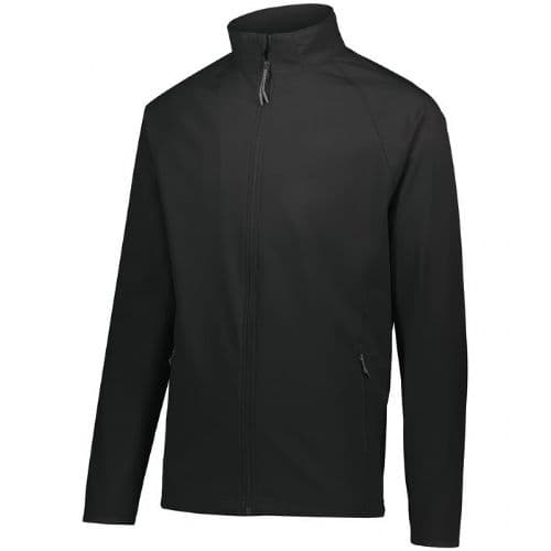 Holloway Men's Featherlight Softshell Jacket Featherlight soft shell fabric is 100% bonded polyester with mechanical stretch and durable water-repellant finish to keep you dry. Wicks Moisture. Woven label. Front zipper with outside storm flap and snaps. Raglan sleeves. Front zippered pockets. Dual inside pockets. Spandex bound cuffs. Open bottom with adjustable elastic hidden drawcord.