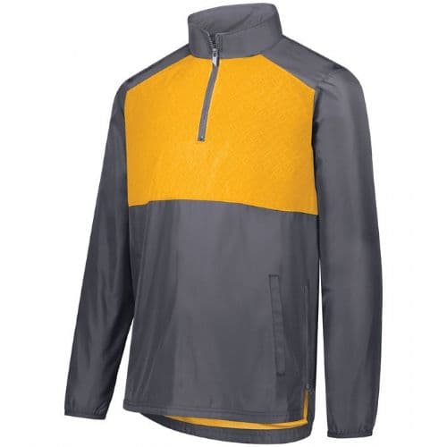 Holloway Men's SeriesX Pullover Micron polyester is a lightweight, wind/water-resistant fabric. Embossed inserts for subtle textured pattern. Micromesh lined nylon body. Taffeta lined sleeves. Woven label. Quarter zip pullover style with zipper garage. Set-in sleeves. Front pockets. Spandex bound cuffs. Side seam zipper for easy on/off. Dropped tail with side vents.
