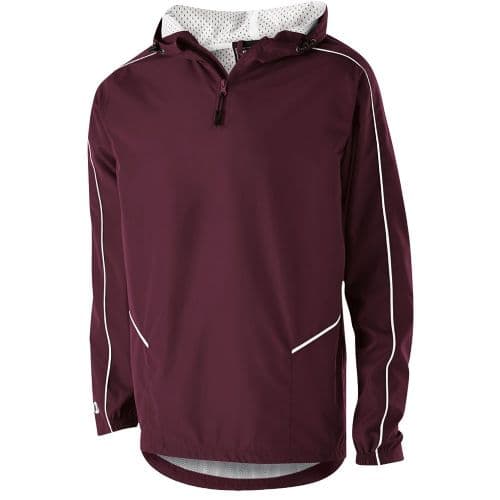Holloway Men's Wizard Pullover Micron Polyester is a lightweight, wind/water resistant fabric. Micromesh lined Nylon body and hood. 1/4-Zip neckline. Front-zippered pockets. Partial elastic cuff. Adjustable bottom hem with hidden shockcord closure in right pocket. Back vent with adjustable closures for full decoration access, built for 14" embroidery hoop. 4.5" Drop tail hem. Classic fit type.