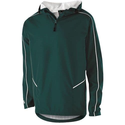 Holloway Men's Wizard Pullover Micron Polyester is a lightweight, wind/water resistant fabric. Micromesh lined Nylon body and hood. 1/4-Zip neckline. Front-zippered pockets. Partial elastic cuff. Adjustable bottom hem with hidden shockcord closure in right pocket. Back vent with adjustable closures for full decoration access, built for 14" embroidery hoop. 4.5" Drop tail hem. Classic fit type.