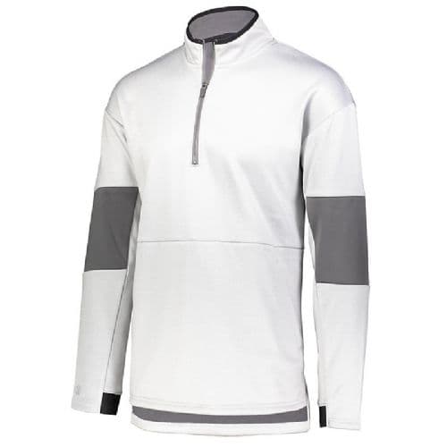 Holloway Sof-Stretch Pullover 100% polyester Sof-Stretch knit with DWR finish bonded to microfleece for warmth. Storm Dfend™ Technology features durable water-resistant finish keeps you dry while knit softshell breathes to keep you comfortable. Wicks Moisture. Half- zip pullover style. Contrast color sleeve inserts. Set-in sleeves. Front zippered pockets. Half-elastic cuffs. Dropped tail bottom with side vents.