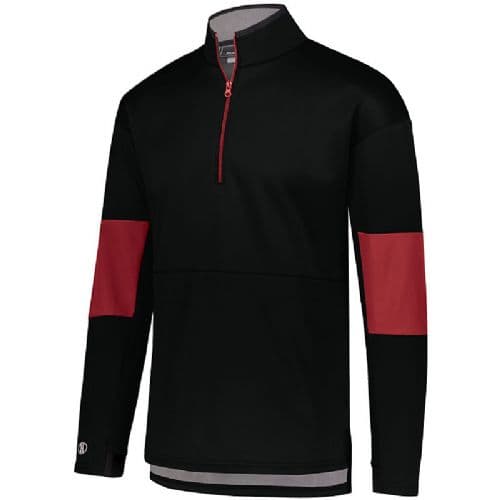 Holloway Sof-Stretch Pullover 100% polyester Sof-Stretch knit with DWR finish bonded to microfleece for warmth. Storm Dfend™ Technology features durable water-resistant finish keeps you dry while knit softshell breathes to keep you comfortable. Wicks Moisture. Half- zip pullover style. Contrast color sleeve inserts. Set-in sleeves. Front zippered pockets. Half-elastic cuffs. Dropped tail bottom with side vents.