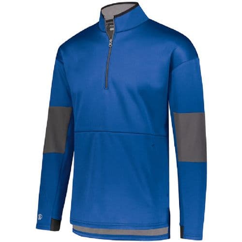 Holloway Sof-Stretch Pullover 100% polyester Sof-Stretch knit with DWR finish bonded to microfleece for warmth. Storm Dfend™ Technology features durable water-resistant finish keeps you dry while knit softshell breathes to keep you comfortable. Wicks Moisture. Half- zip pullover style. Contrast color sleeve inserts. Set-in sleeves. Front zippered pockets. Half-elastic cuffs. Dropped tail bottom with side vents.