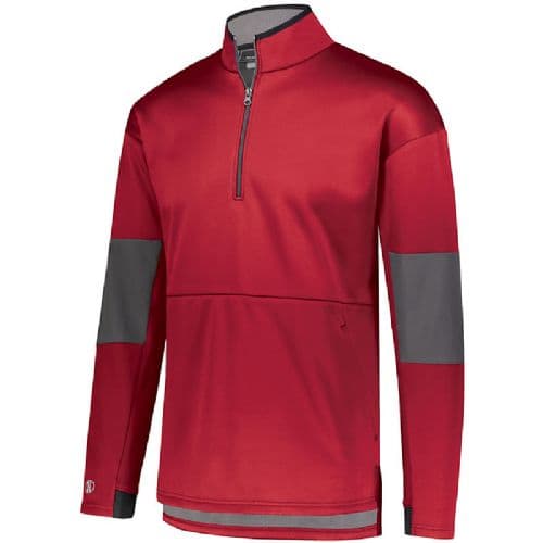 Holloway Sof-Stretch Pullover 100% polyester Sof-Stretch knit with DWR finish bonded to microfleece for warmth. Storm Dfend™ Technology features durable water-resistant finish keeps you dry while knit softshell breathes to keep you comfortable. Wicks Moisture. Half- zip pullover style. Contrast color sleeve inserts. Set-in sleeves. Front zippered pockets. Half-elastic cuffs. Dropped tail bottom with side vents.