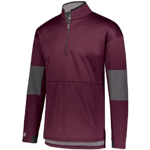 Holloway Sof-Stretch Pullover 100% polyester Sof-Stretch knit with DWR finish bonded to microfleece for warmth. Storm Dfend™ Technology features durable water-resistant finish keeps you dry while knit softshell breathes to keep you comfortable. Wicks Moisture. Half- zip pullover style. Contrast color sleeve inserts. Set-in sleeves. Front zippered pockets. Half-elastic cuffs. Dropped tail bottom with side vents.