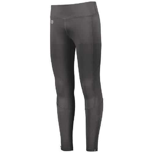 Holloway Women's High Rise Tech Tight Dry-Excel 82% polyester/18% spandex heavyweight knit with high mechanical stretch *4-way stretch for maximum mobility. Ladies' fit. Fits close to body. Tagless label. High waisted, wide flat waistband for secure fit and comfort. Phone pocket on upper right thigh. Reflective detail on lower back leg. Flatlock stitching provides comfort and helps prevent chafing. Zipper on outside lower leg.