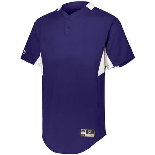 Holloway Youth Two-Button Baseball Jersey Dry-Excel™ 100% wicking polyester diamond knit with true hue technology™ that helps prevent dye migration. Dry-Excel™ 92% Polyester/8% Spandex wicking pinhole mesh with true hue. Wicks moisture. Pad print label. Outside locker label. Two-button placket. Contrast color inserts. Raglan sleeves. Fishtail bottom.