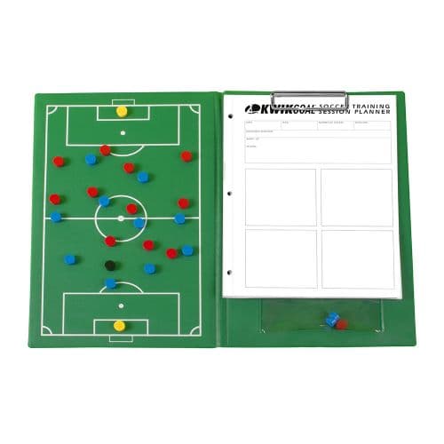 Kwik Goal Soccer Magnetic Board The MB-2 Kwik Goal Soccer Magnetic Board is great for coaches at all levels. Easily review tactics with your players with this hand-held magnetic board. It includes a Soccer Training Session Planner, allowing coaches to plan ahead and ensure their sessions move smoothly. When it comes to communicating player formations, this magnetic field board has always come in handy. The color coded magnetic player pieces help cleanly define drills and game strategy over and over again. You can do the same thing with a chalk or dry erase boards but they often become messy and unreadable fairly quickly.