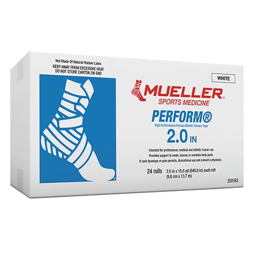 Mueller Perform Tape, 2" x 15 yd, 24 rolls/cs Mueller® Perform Plus™ Tape is a premium-quality zinc oxide adhesive tape. Its porous cloth plus dimpled adhesive texture improves air flow to the area of application. Features serrated edges for quick, hassle-free tearing. Features a smooth consistent unwind for fast and effective taping application.