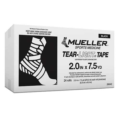 Mueller Tear Light Tape, Black 2" x 7.5yds (24/case) Mueller® Tear-Light® Tape features a superior adhesive with excellent conformability. Easy-to-tear elastic adhesive is ideal for securing lateral knee braces, cold packs, or using as a compression wrap.