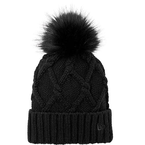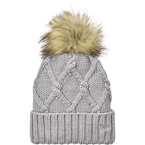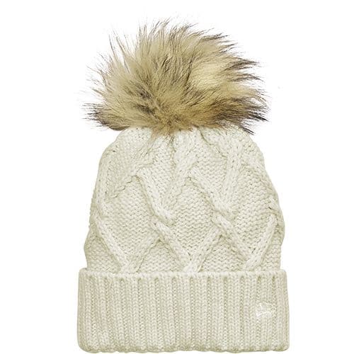 Totally on-trend, this ladies beanie has a thick ribbed cuff and a cable knit crown thats topped off by a fun faux fur pom.
