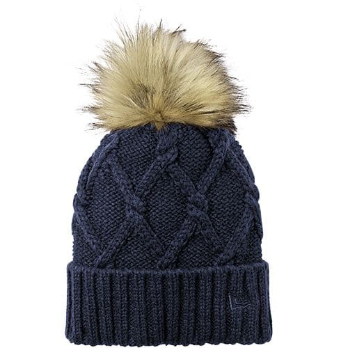 Totally on-trend, this ladies beanie has a thick ribbed cuff and a cable knit crown thats topped off by a fun faux fur pom.
