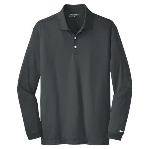Nike Men's Long Sleeve Dri-FIT Stretch Tech Polo Long sleeves elevate this polo to another level of sophistication while Dri-FIT moisture management technology adds unparalleled performance. Stretch fabric for hassle-free swinging motion. Flat knit collar and cuffs. Heat transfer label for tag-free comfort. Three-button placket. Dyed-to-match buttons on White, Black and Midnight Navy. White buttons on Varsity Red, Anthracite and Blue Sapphire. The contrast Swoosh design trademark is embroidered on the lower left sleeve. Side vents. Made of 5-ounce, 100% polyester Dri-FIT fabric.