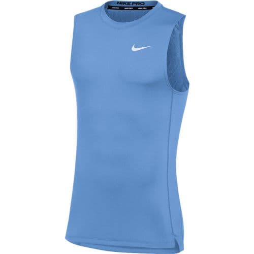 Nike Men's Pro Sleeveless Compression Top The Nike Pro Top hugs you in lightweight fabric with breathability built into heat zones to keep you cool and dry from warmups through cool downs. Stretchy fabric made with at least 75% recycled polyester fibers comes in a tight fit that easily layers under other tops. Nike Dri-FIT technology moves sweat away from your skin for quicker evaporation, helping you stay dry and comfortable. Mesh over high-heat areas at the back and sides lets air flow to help keep you cool when the action heats up. Flat seams feel smooth and make it comfortable to layer under other tops.