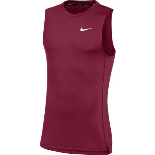 Nike Men's Pro Sleeveless Compression Top The Nike Pro Top hugs you in lightweight fabric with breathability built into heat zones to keep you cool and dry from warmups through cool downs. Stretchy fabric made with at least 75% recycled polyester fibers comes in a tight fit that easily layers under other tops. Nike Dri-FIT technology moves sweat away from your skin for quicker evaporation, helping you stay dry and comfortable. Mesh over high-heat areas at the back and sides lets air flow to help keep you cool when the action heats up. Flat seams feel smooth and make it comfortable to layer under other tops.