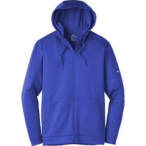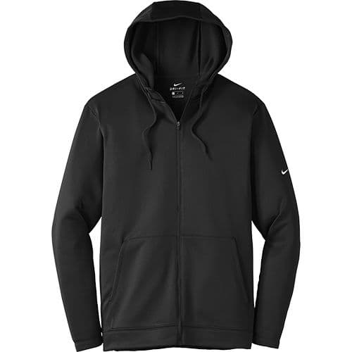 Nike Men's Therma-FIT Full-Zip Fleece Hoodie Nike has elevated the classic hoodie by improving this year-round essential with incredibly warm Therma-FIT fabric which breathes and manages moisture. The design includes a three-panel hood with drawcords, front pouch pockets and open cuffs. The contrast heat transfer Swoosh design trademark is on the left sleeve. Made of 7-ounce, 100% polyester Therma-FIT fabric.