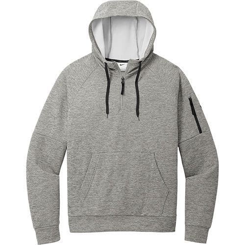 Nike Men's Therma-FIT Pocket 1/4-Zip Fleece Hoodie This 1/4-zip hoodie with a zippered left arm pocket brings the heat to your workout with Therma-FIT fabric. Therma-FIT helps manage your body’s natural heat to keep warm in cold-weather conditions. The design includes a three-panel hood with black drawcords, a dyed-to-match zipper and a front pouch pocket. Self-fabric cuffs and hem. A contrast Swoosh logo is embroidered on left sleeve. A contrast Therma-FIT logo is embroidered on back hem. Made of 7.4-ounce polyester Therma-FIT fabric.