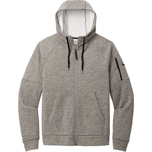 Nike Men's Therma-FIT Pocket Full-Zip Fleece Hoodie This full-zip hoodie with a zippered left arm pocket brings the heat to your workout with Therma-FIT fabric. Therma-FIT helps manage your body’s natural heat to keep warm in cold-weather conditions. The design includes a three-panel hood with black drawcords, a dyed-to-match zipper and front pockets. Self-fabric cuffs and hem. A contrast Swoosh logo is embroidered on left sleeve. A contrast Therma-FIT logo is embroidered on back hem. Made of 7.4-ounce polyester Therma-FIT fabric.