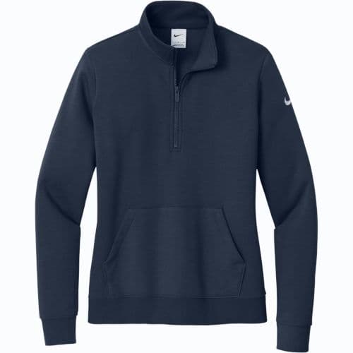 Nike Women's Club Fleece Sleeve Swoosh 1/2-Zip Pullover Built with versatility in mind, this brushed-back 1/2-zip has an elevated look which makes it perfect for work or play. It’s a sustainable choice with recycled polyester and organic cotton in the blend. Design details include a zip-through collar with dyed-to-match zipper. Front pouch pocket. Rib knit cuffs and hem. A contrast Swoosh logo is embroidered on left sleeve. Made of 8.3-ounce, 72/20/8 cotton/recycled polyester/organic cotton.
