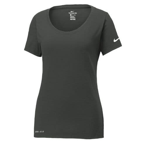 Nike Women's Dri-FIT Cotton Blend Scoop Neck Tee This Nike performance tee features sweat-wicking fabric to help keep you dry and comfortable. Durable rib knit scoop neck. Heat transfer label for tag-free comfort. Double-needle stitching throughout. Contrast heat transfer Swoosh design trademark on left sleeve. Contrast heat transfer Dri-FIT logo at right hem. Made of 4.7-ounce, 60/40 cotton/polyester Dri-FIT fabric.
